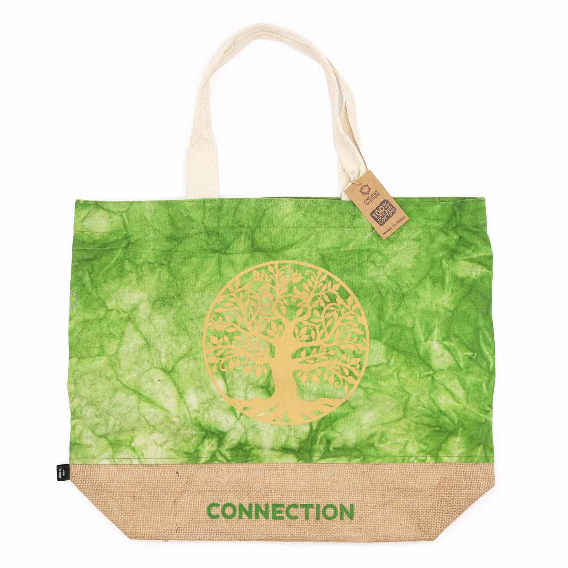 Stonewash Green All Natural Eco-Friendly Jute and Cotton Tote Bag - Tree of Life / Connection