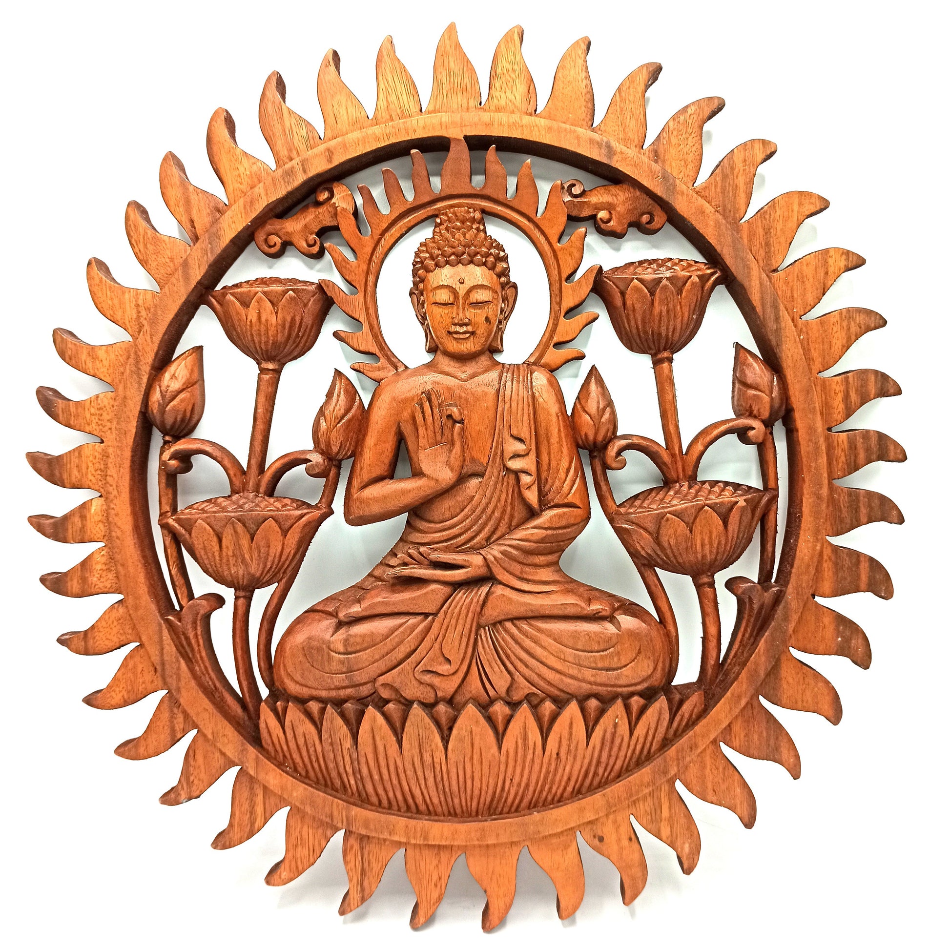 Buddha and Lotus Flower - Handmade Decorative Suar Wooden Plaque - 40cm