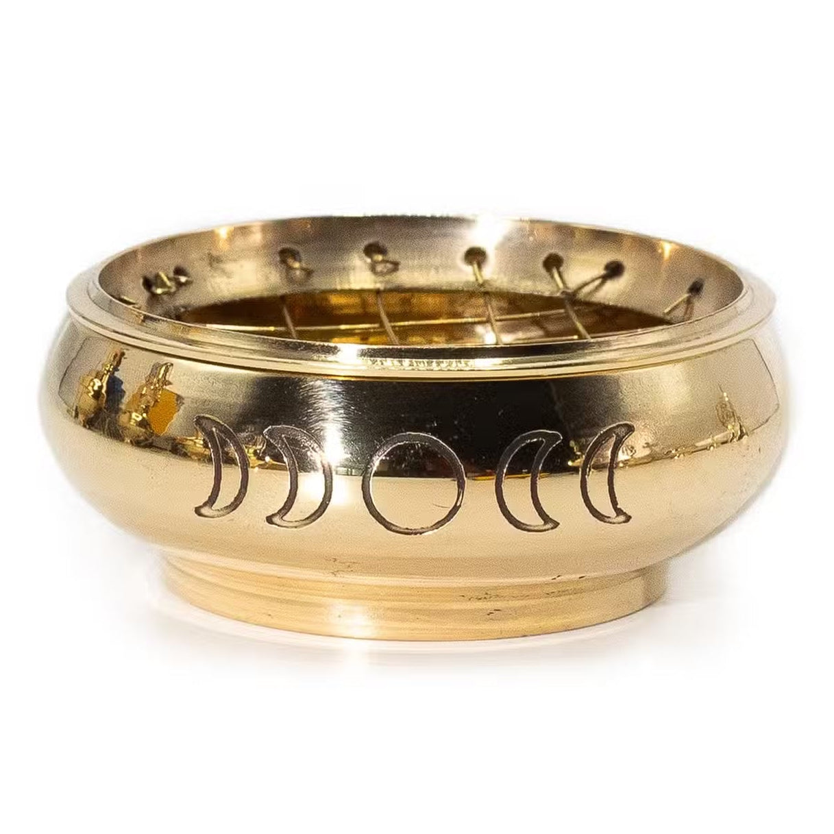 Handmade in India from polished brass, this wide incense jar is engraved with the full lunar cycle.