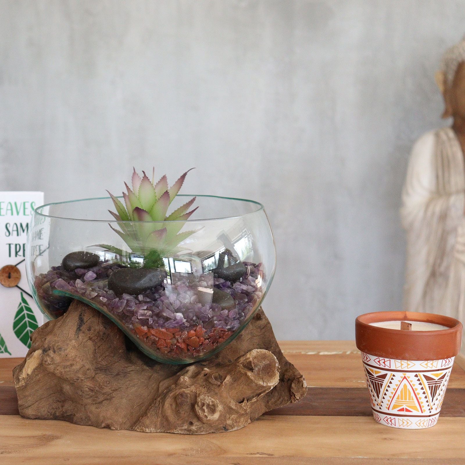 The glass is hand-blown and while still hot it is then relaxed over a piece of Gamal root, the glass then hardens to the shape of the wood ensuring a perfect fit.