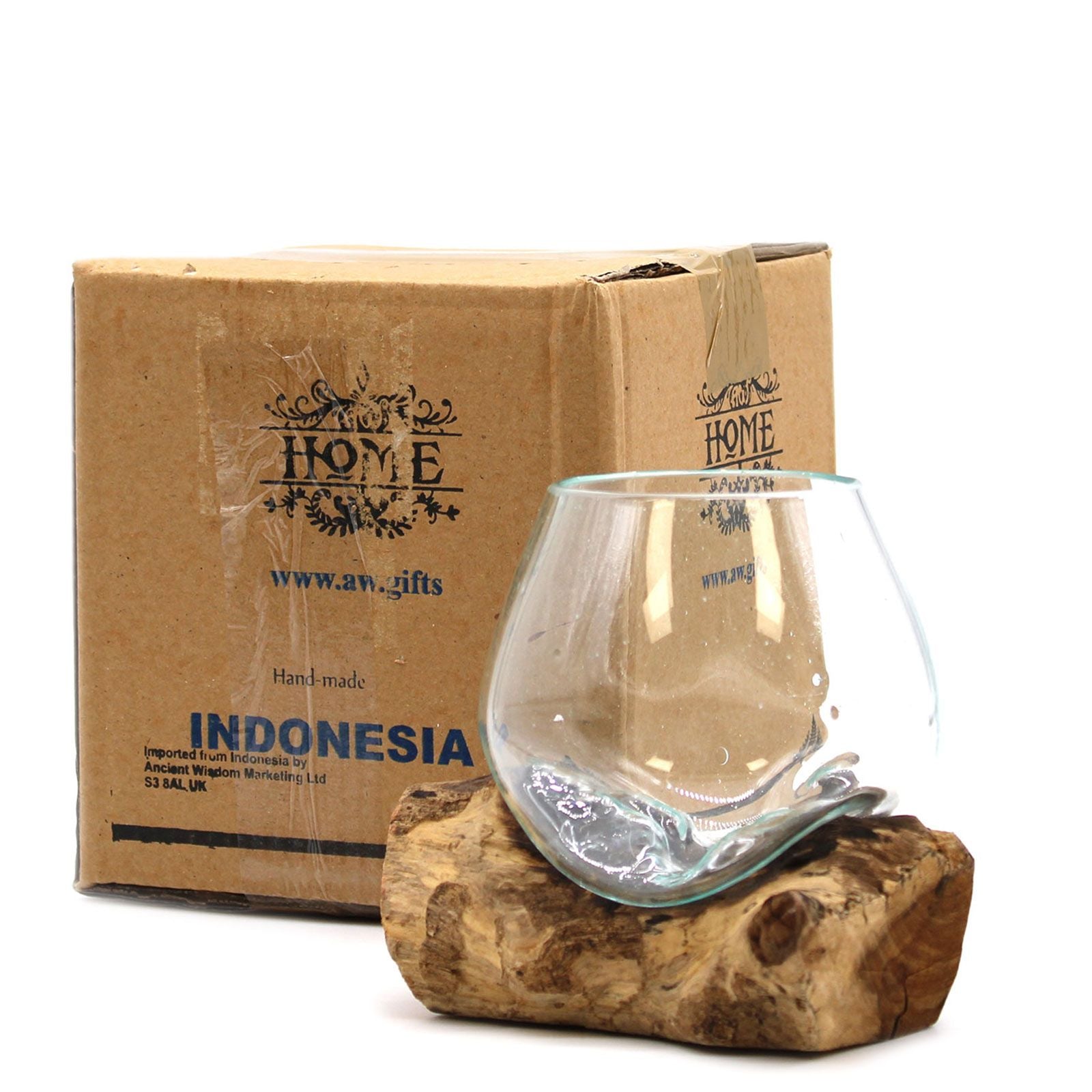 The glass is hand-blown and while still hot it is then relaxed over a piece of Gamal root, the glass then hardens to the shape of the wood ensuring a perfect fit.